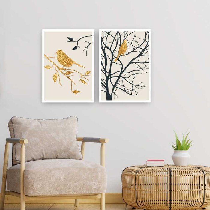 Quadros Pássaro Dourado Moldura Branca 2X 45X30Cm Colorido