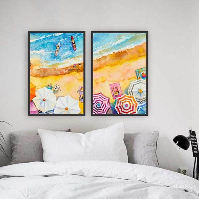 Quadros Decorativos Duplo Praia Aquarela 45x30cm Moldura Preta. Acabamento Moldura Preta. Tamanho: Kit com 2 quadros 45x30cm cada. Material: Quadrinho Adesivo. Referência: QMCDPAQ-30x40cm-Moldura Preta. Imagem impressa no adesivo com proteção vinílica que possibilita limpeza com álcool ou pano úmido. Moldura de madeira reta e lisa com 2 cm de largura. O verso do quadrinho possui acabamento selado e pendurador . Não possui vidro.
