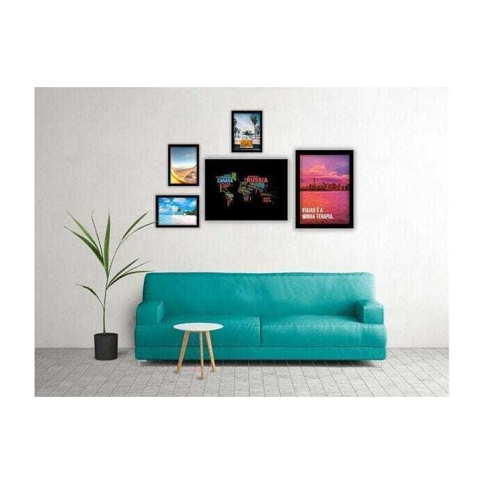 - Composição: 5 quadros decorativos, sendo 2 30x42cm (Mapa Mundi Black com Nomes de Países, Viajar é Minha Terapia) e 3 20x30cm (Janela do Avião, Praia e Perua de Surf).