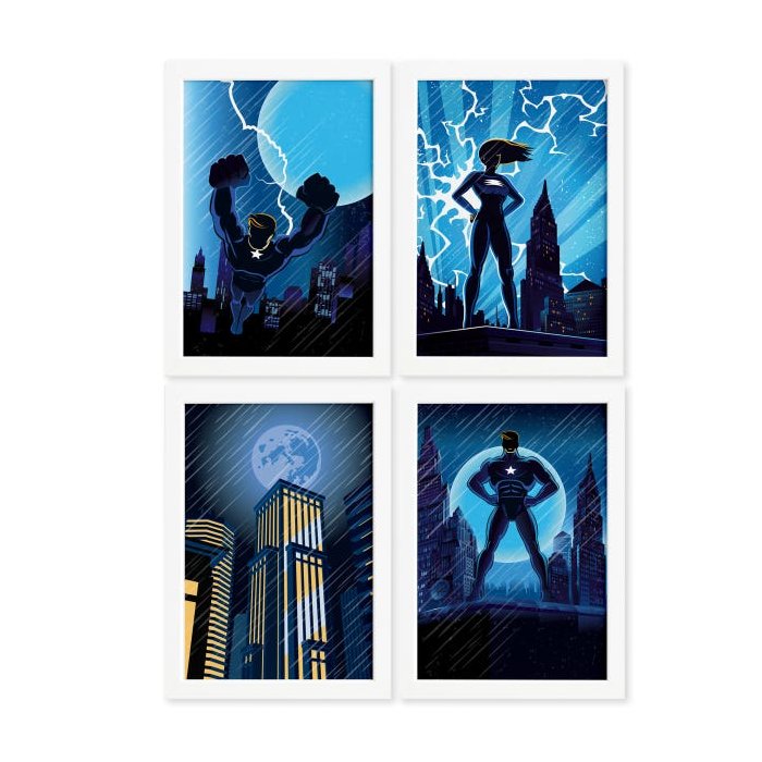 Quadros Super Heróis Geek Moldura Branca 33x43cm 4un Azul