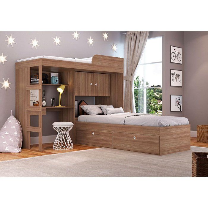 Conheça o Quarto Juvenil com Cama Alta Lion e cama Tókio, fabricado pela Art In Móveis. Sendo uma cama alta de solteiro multifuncional, no modelo Lion, e outra cama de solteiro com quatro portas, no modelo Tókio, para colchões de 188 X 78 cm com montagem esquerda ou direita. A Art In Móveis pensando no conforto e praticidade desenvolveu a Quarto Juvenil com Cama Alta Lion e cama Tókio, é compacta e ideal para transformar o seu ambiente. Une várias funcionalidades em um único móvel, dispondo de duas camas de solteiro, escada, escrivaninha com gaveta, baú, prateleiras e armário. Este produto foi Produzido em excelente material MDP 15 mm e com acabamento em Finish Foil Acetinado, que garante maior resistência e qualidade em seu móvel. A essência de criar soluções que trazem mais conforto sua vida é o grande diferencial dos produtos Art In Móveis. Cada nova ideia é uma mistura de criatividade, funcionalidade e muita dedicação. Para colchões de 188 x 78 cm/ montagem esquerda ou direita/ baú e estação de trabalho/ altura estrado cama baixa 37cm/ altura estrado cama alta 138cm