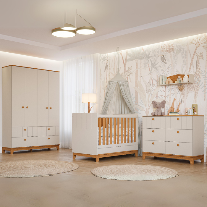 Quarto Bebê Completo Berço Americano Cômoda Guarda Roupas Fendi/Nature, Branco Acetinado/Nature e Off White/Nature