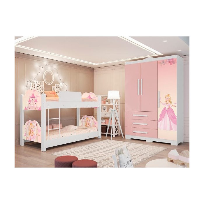 Quarto Beliche Solteiro e Guarda-Roupa Menina Princesa Rosa Rosa