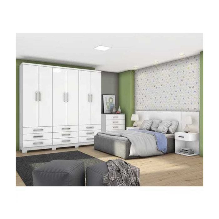 Quarto Completo Casal Lara, é ideal para você que quer aliar qualidade, modernidade e aconchego, estrutura em MDP, acabamento com pintura Uv (Brilho). Roupeiro conta com 06 portas de bater com dobradiças metálicas, 09 gavetas externas com corrediças metálicas, prateleiras internas, puxadores em ABS cromado, maleiro reforçado, cabideiros resistentes em alumínio, acompanha pés em ABS. Cômoda conta com 05 gavetas com corrediças metálicas e puxadores em ABS. Cabeceira com 02 mesa de apoio que suportam até 8 kg cada e mais 02 gavetas com corrediças metálicas de cada lado, é ideal para cama box Casal de 138 cm ou box Queen de 158 cm, é extensível na largura, você escolhe o tamanho que precisa na hora da montagem. Este móvel chegará em sua casa separado em 07 volumes.