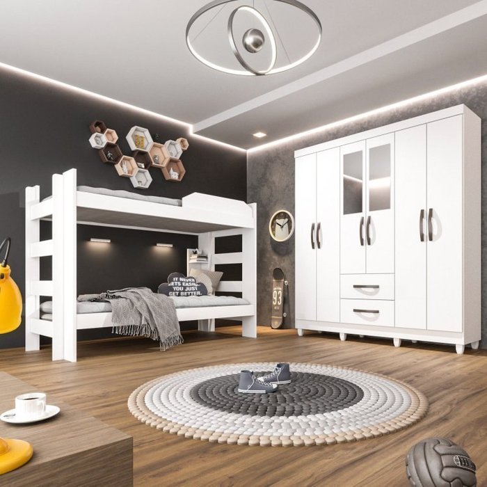 Quarto Completo com Guarda Roupa 6 Portas e 2 Gavetas e Beliche Sallêto Móveis Branco