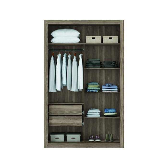Possui um roupeiro de 2 portas de correr que deslizam sobre trilhos de alumínio e são sustentadas por perfis em metal nas laterais.