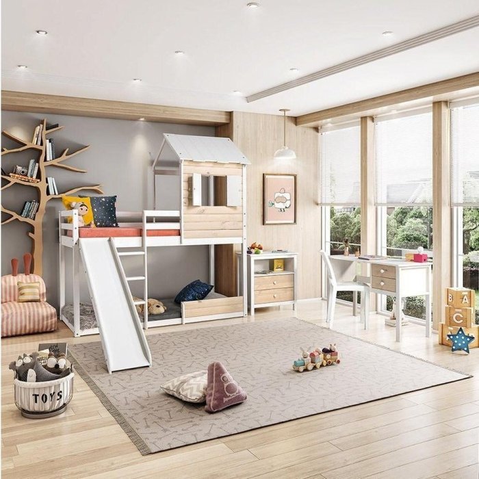 Quarto Completo Montessoriano Club House Wood c/Beliche e Escorregador Casatema MadeiraOriginals Branco/Natural