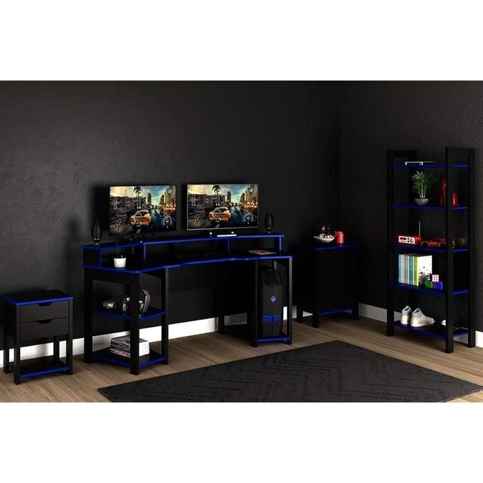 Quarto Completo Solteiro Gamer 4 Peças (Mesa Cabeceira + Mesa de Computador + Balcão + Estante) Preto/Azul - Tecno Mobili