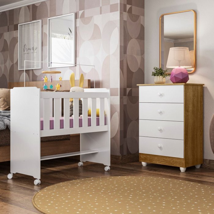Quarto de Bebê 100% MDF Com Mini Berço e Cômoda Soft Life Branco/Madeirado Ypê