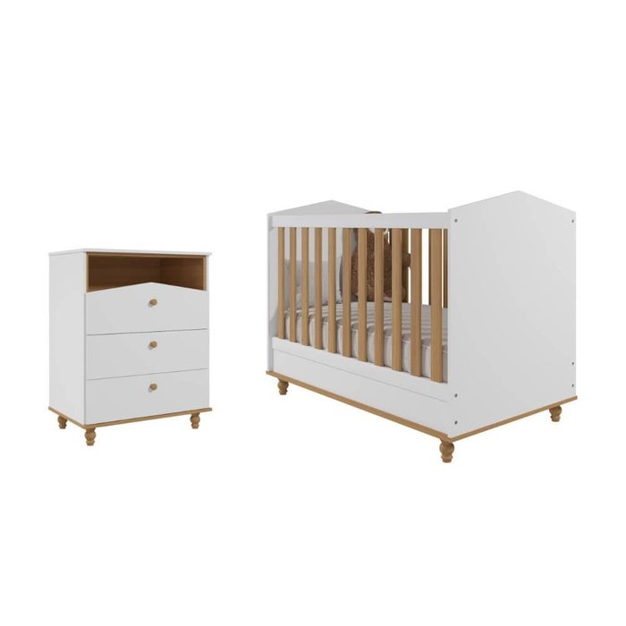 Quarto de Bebê 2 peças com 3 Gavetas Permóbili Casinha Mimo - Branco/Nature Branco/Nature