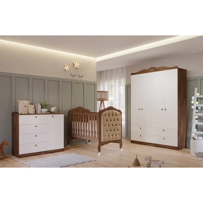 Quarto de Bebê 3 Peças com Berço Capitonê Cômoda 4 Gavetas e Guarda Roupa 4 Portas 4 Gavetas Aquarel