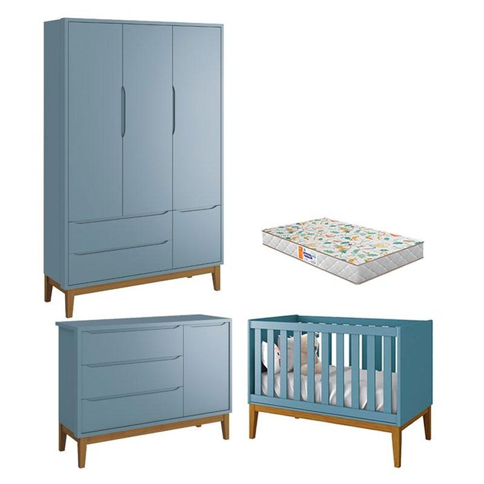 Quarto de Bebê 3 Portas New Classic Azul com Pés Madeira e Colchão Gazin – Reller
