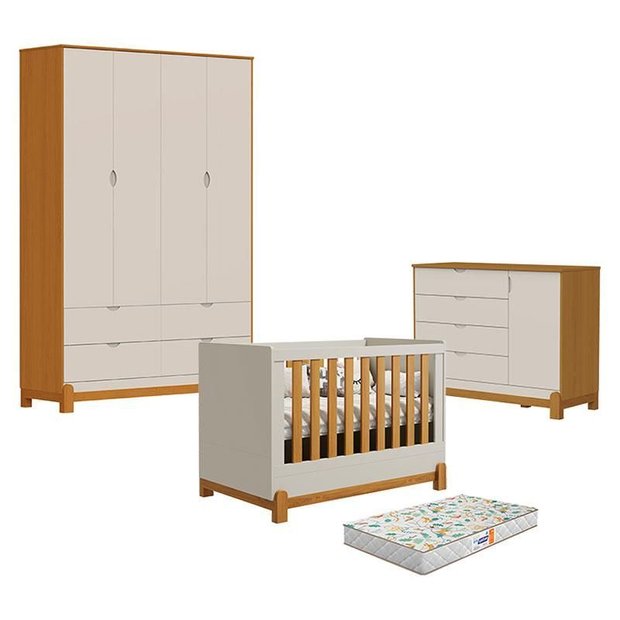 Quarto de Bebê 4 Portas com Cômoda Sapateira Lótus Liso Areia Savana e Berço Americano Lótus Liso Areia Savana com Colchão Gazin - Reller