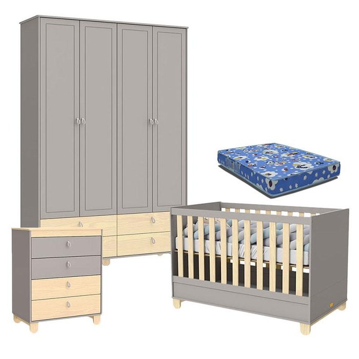 Quarto de Bebê 4 Portas Rope Cinza Natural com Colchão - Matic