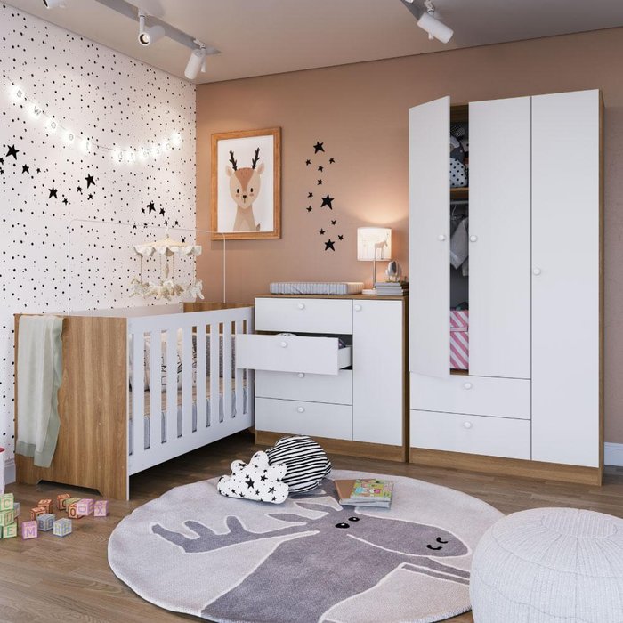 Quarto de Bebê Aconchego Completo III - Branco/Nogal
