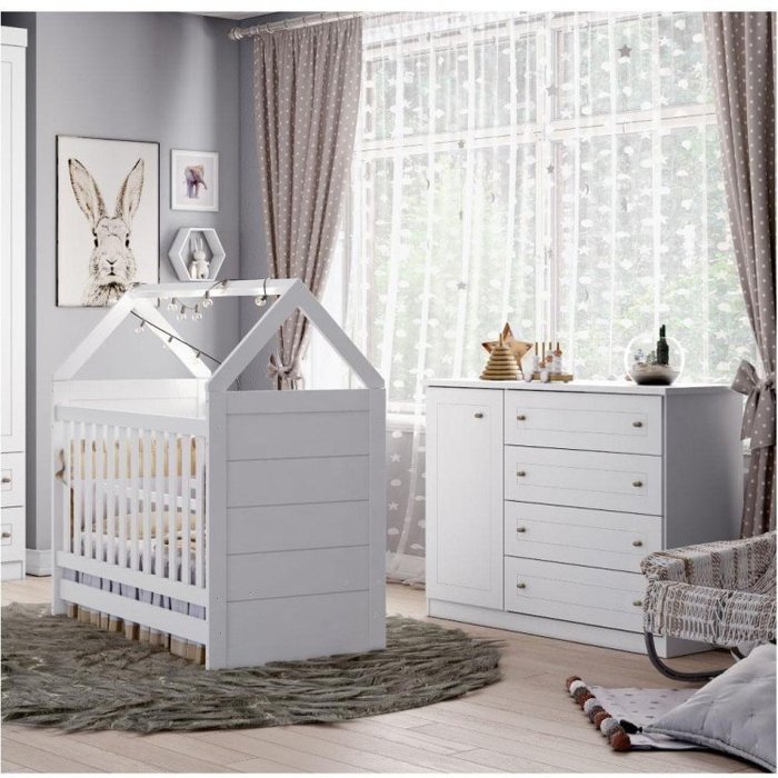 Quarto de Bebê Americano Berço Mini Cama e Cômoda 4 Gavetas Branco