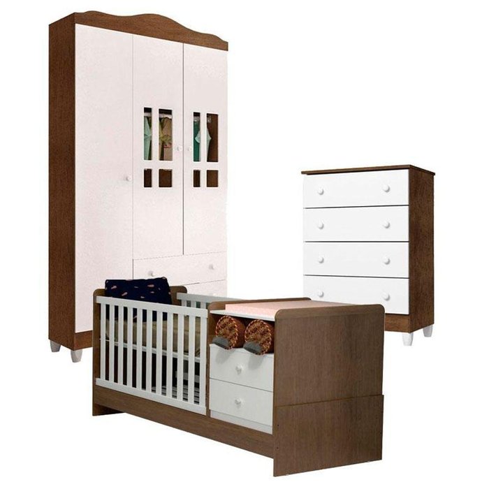 Quarto De Bebê Ariel 3 Portas Com Berço Multifuncional Selena Branco Acetinado Amadeirado - Carolina