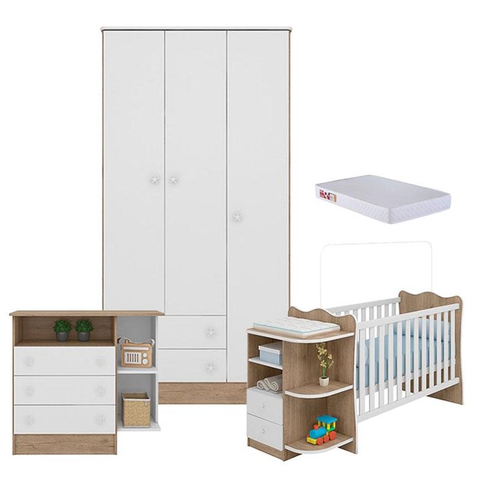 Quarto de Bebê com Berço 101 Doce Sonho Carvalho Rústico TOQ Branco e Colchão - Qmovi Carvalho Rústico TOQ Branco