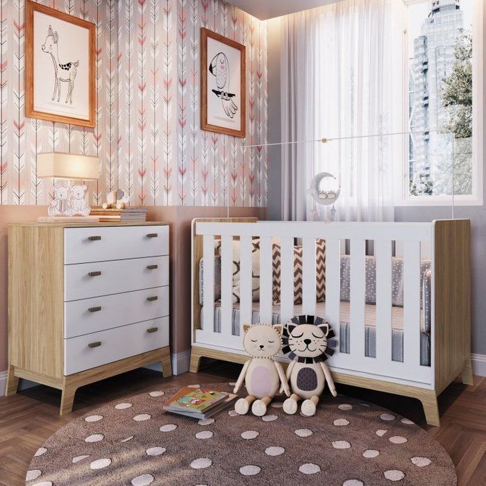 Quarto de Bebê com Berço 3 em 1 86x136,6x86cm e Cômoda 4 Gavetas Favo de Mel