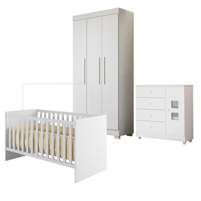 Quarto de Bebe com Berço com Suporte Mosquiteiro Life Cômoda de Bebê Life Guarda-roupa Flórida Branco