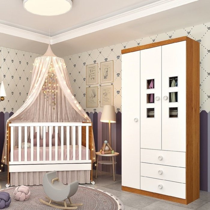 Berço Sofá Mini Cama Sonetto certificado pelo INMETRO, painéis em MDF , grade em PVC, estrado em pinus e ripas multilaminadas, acompanha rodízios, mini cama e sofazinho. Roupeiro 3 portas Sonic em MDF, 3 gavetas com corrediças metálicas, 9 dobradiças 26mm, puxadores em PVC, cabideiro em alumínio, aplique nas portas em PVC.