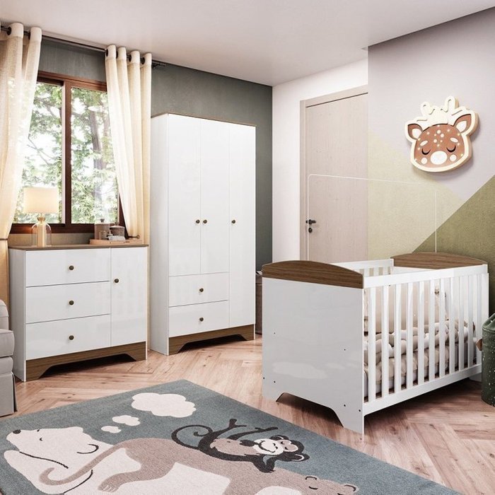 Quarto de Bebê com Guarda Roupa Cômoda e Berço Americano 100% MDF Ayla Branco Brilho/Carvalho