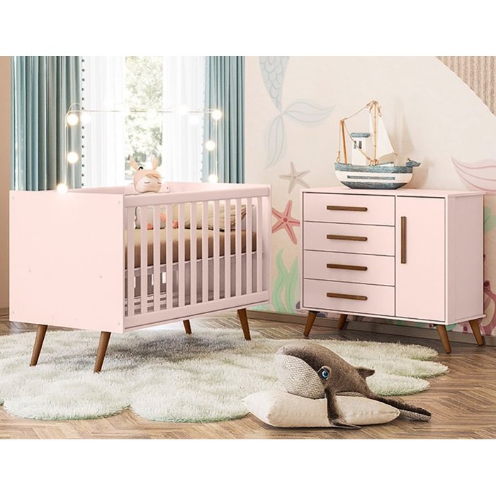 Quarto De Bebê Cômoda e Berço Q Encanto Retro Rosa - Qmovi