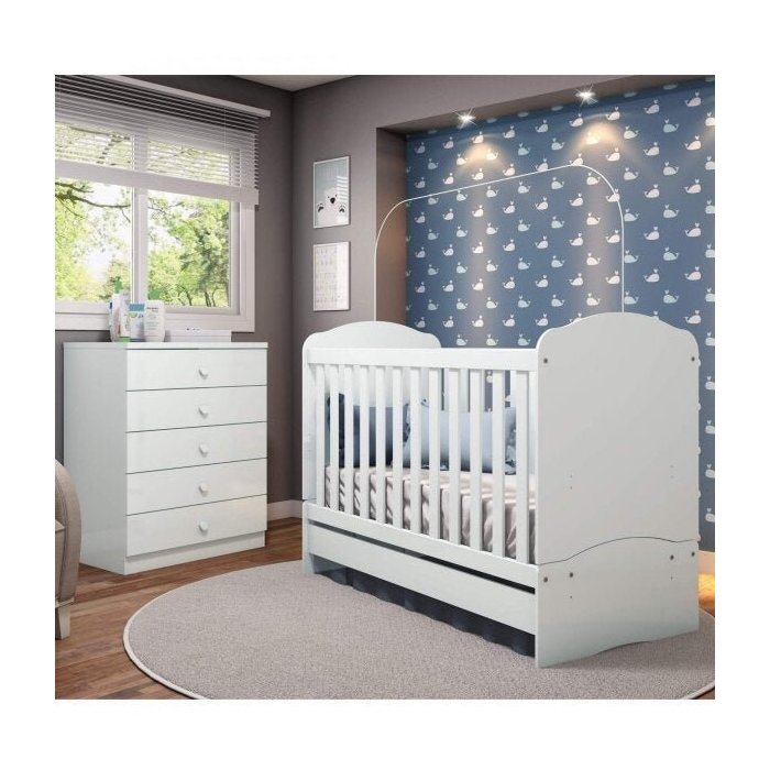 Esse lindo Conjunto de Quarto é tudo o que você pediu em um único ambiente. Toda essa combinação foi pensada para que este conjunto permaneça em sua casa por muitos anos acompanhando o crescimento de seus pequenos. A Cômoda possui 5 gavetas com corrediças metálicas, que permite um deslize mais seguro e suave, amplo espaço para acomodar as roupas e objetos do bebê. Produzido em MDP e pintura UV, que protege o móvel e assegura sua qualidade e resistência.O Berço Mini Cama é produzido em MDP, a sustentação possui revestimento interno e externo com pintura UV, esse revestimento assegura durabilidade ao móvel. Além de suas funcionalidades como, estrado com regulagem de altura, mosquiteiro, o berço se transforma em Sofá-cama e Mini Cama. Ideal para colchão de 60cm.