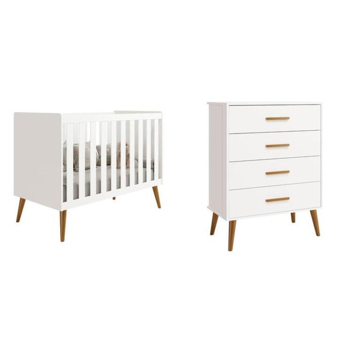 A cômoda Isis e o Berço são uma excelente opção pra quem procura por qualidade, beleza e praticidade. Seus pés retro em madeira dão charme e elegância ao produto. A cômoda Possui 4 gavetas espaçosas, corrediças telescópicas e puxadores em madeira e o berço possui 3 posições de estrado, acompanha suporte para mosquiteiro e ainda se transforma em uma linda mini cama.