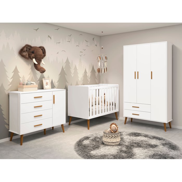 O Conjunto Isis é uma excelente opção pra quem procura por qualidade, beleza e praticidade. Seus pés retro em madeira dão charme e elegância ao produto. O berço possui 3 posições de estrado, acompanha suporte para mosquiteiro e ainda se transforma em uma linda mini cama. A comoda possui 4 gavetas espaçosas, corrediças telescópicas e puxadores em madeira. O roupeiro possui gavetas espaçosas, portas, cabideiro, prateleiras, corrediças telescópicas e puxadores em madeira.