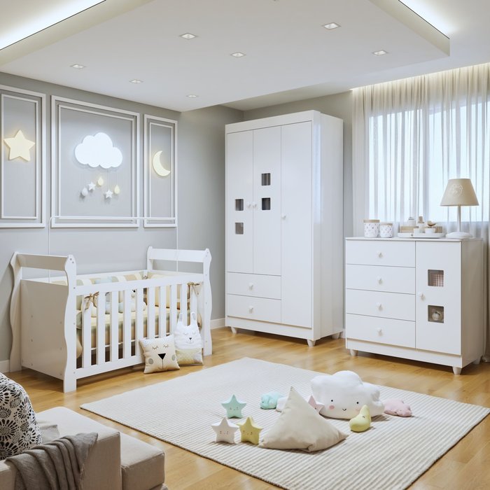 O Quarto de Bebê Completo Bibi traz conforto e funcionalidade para o cantinho do seu bebê. Com um design elegante e prático, o conjunto inclui um guarda-roupa espaçoso, perfeito para organizar as roupinhas, um berço seguro e confortável, e uma cômoda com amplas gavetas para facilitar o armazenamento dos itens essenciais do bebê. Este quarto combina qualidade e sofisticação, proporcionando um ambiente acolhedor para o seu bebê crescer com estilo e bem-estar.