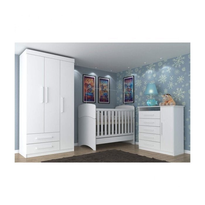 Quarto de Bebê Completo Guarda-Roupa 3 Portas Cômoda 5 Gavetas e Berço Mini Cama Rodial Branco