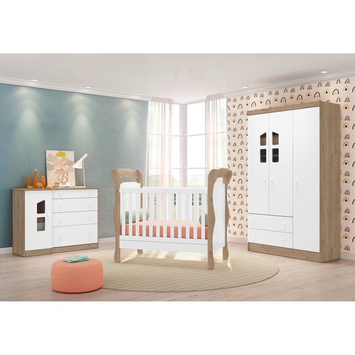 Conjunto Quarto Infantil Tunisia Carvalho Rústico Branco O Conjunto Quarto Infantil Tunisia é perfeito para você que quer um quarto mais organizado, bonito e aconchegante! Amplo espaço interno com prateleiras estrategicamente posicionadas para melhor organização; Com um design sofisticado, ele deixará seu ambiente mais moderno e aconchegante. Produzido em MDP 12 e 15 mm. Puxadores em MDF Dimensões do Produto: Guarda Roupa: Altura: 204 cm Largura: 122 cm Comprimento: 47 cm Berço Mini Cama: Altura: 122 cm Largura: 73,5 cm Comprimento:153 cm Comoda: Altura: 98,5 cm Largura: 125 cm Comprimento: 47 cm Informações Complementares: Gavetas: Sim (4) Portas: Sim (3) Material: MDP/MDF Itens Inclusos: - 01 Guarda Roupa; -01 Cômoda; -01 Berço Mini Cama - Kit completo para montagem, Manual detalhado de instruções para montagem Garantia 3 meses contra defeito de fabricação Informações Adicionais: - Fotos meramente ilustrativas do produto no ambiente. - Os objetos que ambientam as fotos não acompanham o produto; - Verificar descrição e tamanho do produto antes da compra. - Avaliar a mercadoria no ato do recebimento e recusar em caso de divergência ou avarias. - Mantenha as informações de contato e endereço de entrega atualizados para entrarmos em contato caso necessário. - Limpar com flanela ou pano macio seco, não utilizar produtos abrasivos, desengordurantes, álcool ou solvente. Não expor o produto diretamente à luz solar e à umidade. * Sugerimos a contratação de um montador profissional para a montagem do produto. Não nos responsabilizamos por avarias causadas no ato da montagem. * Não nos responsabilizamos pela montagem e desmontagem do produto no ato da entrega e devolução, assim como os custos gerados nestas situações. * A transportadora entregará o produto no andar térreo do endereço de entrega. * Não nos responsabilizamos por subir escadas, corredores e elevadores ou transporte por guincho em apartamentos.