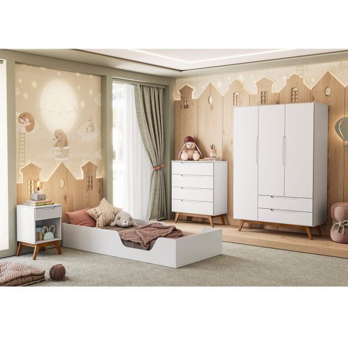 Quarto de Bebê Montessoriano Completo com Cama, Cômoda, Guarda roupa e mesa de cabeceira Retrô Sonhare Branco