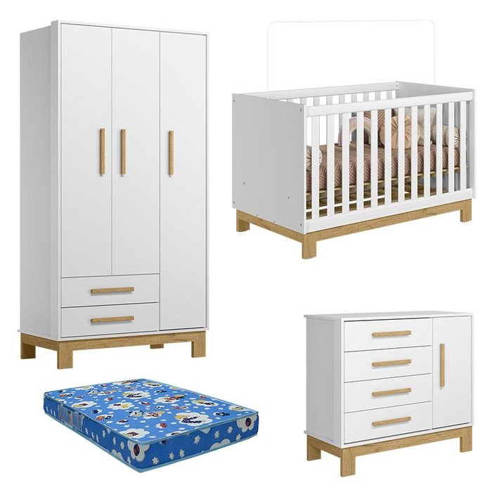 Quarto de Bebê Q Encanto Slim Branco Acetinado com Colchão Ortobom – Qmovi