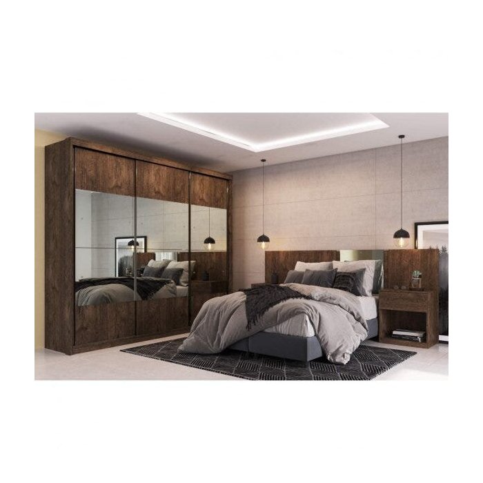 Quarto de Casal com Guarda-Roupa 3 Portas 3 Gavetas e Cabeceira com 2 Mesas de Apoio Kara Espresso M