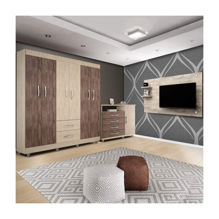 Quarto de Casal com Painel, Cômoda e Guarda-Roupa 6 Portas Chris Espresso Móveis neutra