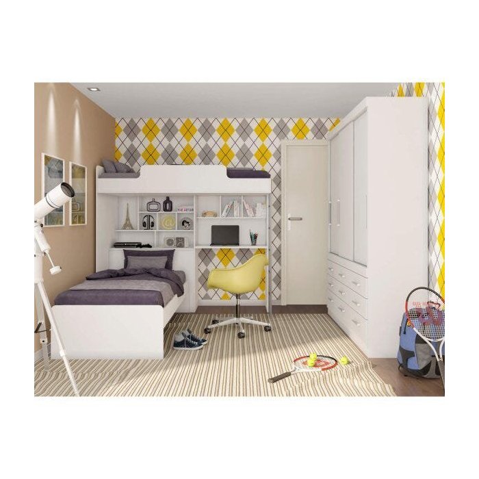 Quarto de Solteiro Completo com Beliche e Guarda-Roupa 3 Portas e 9 Gavetas Will Espresso Móveis Branco