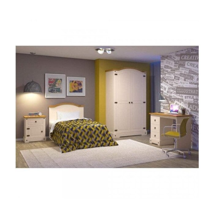 Quarto de Solteiro Guarda-Roupa, Escrivaninha, Mesa de Cabeceira e Cabeceira Smile Móveis Móveis Ser Creme/Carvalho