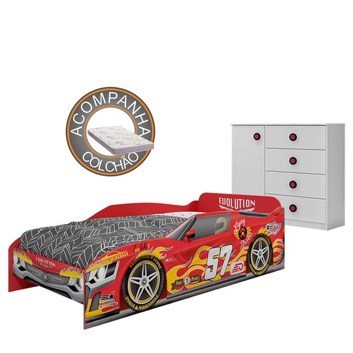 Quarto Infantil com Cômoda e Cama Carros Evolution Car Branco/ Vermelho Móveis Estrela c/ Colchão Or