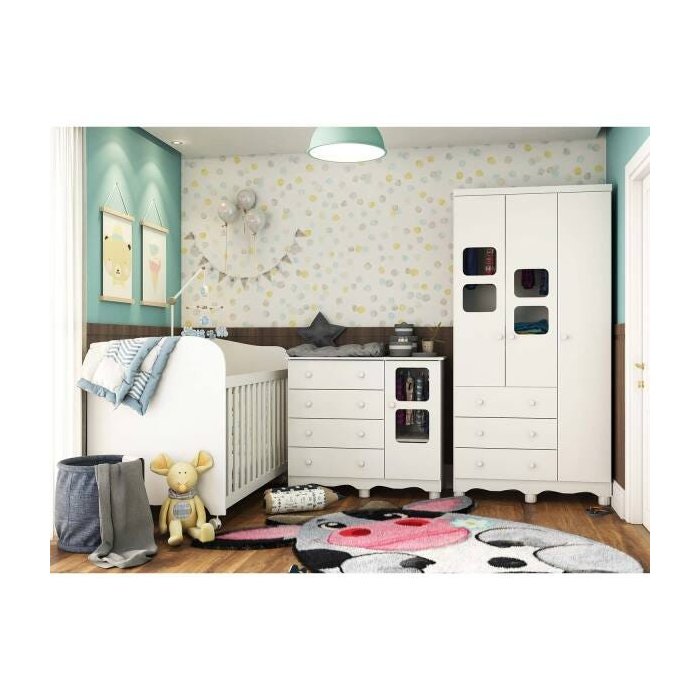 Quarto Completo Infantil com Guarda Roupa Uli 03 portas, Berço Uli Americano e Cômoda Uli Móveis Peroba O seu bebê merece o melhor!! Deseja um ambiente organizado e com muita elegância e com produtos funcionais para o quarto do seu bebê? Que tal um jogo de Quarto Completo? Isso mesmo! Aproveite esse jogo completo com Guarda Roupa Uli 03 portas e Cômoda Uli que leva muito charme e conforto e o Berço Uli Americano que é super moderno e despojado. Não é demais? Além disso todos são feitos com 100% MDF e acabamento com tinta atóxica. Aproveite! Especificações do Guarda Roupa: - Modelo: Uli - Branco - Altura: 188,5 cm - Largura: 91,9 cm - Profundidade: 41,5 cm - Material: 100% Mdf - Acabamento: Pintura UV - Possui Porta: Sim - Possui Gaveta: Sim - Possui Vidro: Sim - Possui Pés: Sim - Número de Portas: 3 portas - Número de Gavetas: 3 gavetas Especificações do Berço: - Modelo: Uli Americano - Branco - Altura: 98,6 cm - Largura: 132,4 cm - Profundidade: 76 cm - Altura do Estrado até o Chão: 18,8cm - Material Estrado: Madeira - Tipo de Estrado: Removível - Material: 100% MDF - Material dos Pés: Plástico - Montagem Flex: Não - Possui Gavetas: Não - Possui Rodízio: Sim - Acompanha Colchão: Não Especificações da Cômoda: - Modelo: Uli - Branco - Altura: 88,0 cm - Largura: 95,3 cm - Profundidade: 42,0 cm - Material: 100% MDF - Possui Vidro: Sim - Possui Prateleira: Sim - Possui Porta: Sim - Possui Gaveta: Sim - Número de Portas: 1 porta - Número de Prateleira: 1 prateleiras - Número de Gavetas: 4 gavetas Especificações Técnica: - Ambiente: Quarto Infantil - Tipos de Corrediças: Metálicas - Tipo dos Puxadores: Externo - Material das Dobradiças: Metálicas - Material dos Puxadores: Plástico - Peso por Prateleira: 5kg - Peso por Gaveta: 4kg - Garantia: 90 dias - Conteúdo da Embalagem: 1 Quarto Completo com Guarda Roupa Uli 03 portas, Cômoda Uli e Berço Uli Americano Branco - Necessita Montagem? Sim, acompanha esquema de montagem. - Peso: 117,24 kg Quarto Infantil - Perguntas Frequentes: Onde é a loja de vocês? - Nossa loja é especializada em Móveis, localizada Sooretama-ES um dos maiores polos da industria de móveis do Brasil. Vocês enviam para todo brasil e como é enviado para minha casa? - Enviamos para todo Brasil e todos os nossos produtos são enviados via transportadora em embalagens 100% lacradas e protegidos. Seus móveis possuem garantia e nota fiscal? - Todos os produtos possuem garantia e todos seguem com a nota fiscal em nome do comprador. Dica de limpeza e informações importantes: - Limpar com um pano umedecido seguido de um pano seco - Nunca utilizar utilizar produtos químicos - As imagens ambientadas são meramente ilustrativas e podem apresentar itens que não compõe o produto. - As cores do produto podem variar de acordo com o monitor, a iluminação do ambiente ou sua percepção visual. A Palácio Móveis não oferece serviço de montagem dos produtos, mas todos os produtos acompanham esquema de montagem. É recomendável que o serviço seja feito por um profissional.
