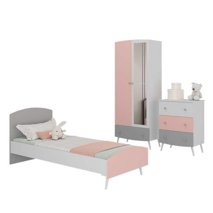 A cômoda com 3 gavetas possui amplo espaço interno para acomodar peças e objetos essenciais, mantendo-os sempre ao alcance das mãos. O sistema antitombamento oferece segurança total enquanto a criança estiver no ambiente. O guarda-roupa e a cômoda contam com corrediças telescópicas, que proporcionam um manuseio suave e silencioso, pés retrô em polipropileno e puxadores redondos em ABS, completando o design moderno e elegante do quartinho.