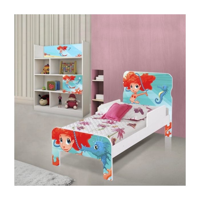 Quarto Infantil Completo - Cama Infantil Adesivada Sereia Ruiva e Estante Infantil Adesivada Sereia Ruiva