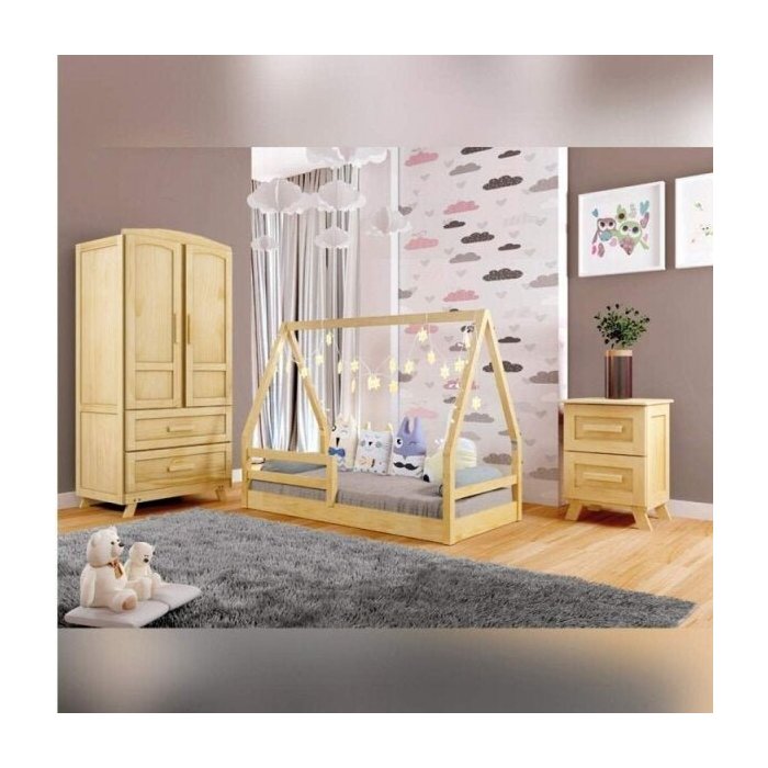 Quarto Infantil Completo com Mini Cama Montesoriana, Guarda-Roupa e Mesa de Cabeceira Rodmóveis Pinus Natural