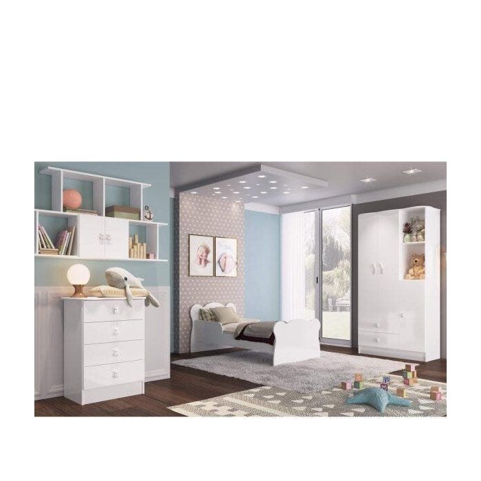 Quarto Infantil Completo Docinho com Guarda-Roupa 3 Portas, Cômoda, Mini Cama e Nicho Espresso Móvei Branco