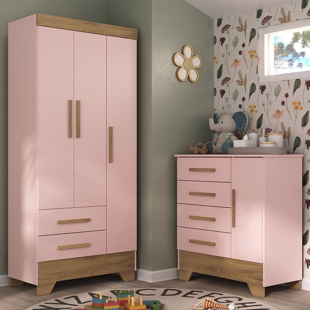 Quarto Infantil Completo Guarda Roupa 3 Portas 2 Gavetas com Cômoda Selene Espresso Móveis Rosa Fosco/Nature