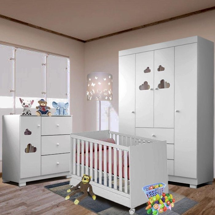 Quarto Infantil Completo Lília com Guarda Roupa 4 Portas, Cômoda 1 Porta e Berço Branco - PhoenixQuarto Lília é moderno e espaçoso. Conta com cômoda e guarda roupa ambos com corrediças metálicas e dobradiças metálicas, produzida em MDF com pintura UV de alto brilho é feita diretamente na madeira tratada, proporcionando assim um acabamento melhor ao móvel e Berço 2 em 1 Doce Sonho que vai trazer qualidade e conforto para o bebê.É o produto ideal para você que quer aliar qualidade, modernidade e aconchego ao quartinho seu filho ou filha.INFORMAÇÕES TÉCNICAS - GUARDA ROUPACor: BrancoPorta: 4Gaveta: 3Peso: 71 KgAltura: 1.88 cmLargura: 1.32 cmProfundidade: 44 cmINFORMAÇÕES TÉCNICAS - CÔMODACor: BrancoPorta: 4Gaveta: 3Peso: 31 KgAltura: 91 cmLargura: 91 cmProfundidade: 42 cmINFORMAÇÕES TÉCNICAS - BERÇOAltura: 77 cmLargura: 75 cmProfundidade:133,2 cmPeso: 30 KgBerço Padrão Americano (70 cm).Estrado em MDF com chapas de 6mm.Travessas do estrado em MDF com chapas de 25mm.Grade em MDF com pintura UV atóxica.Estrutura do berço em MDP de 15mm com borda retasProduto com três regulagens de altura do estrado:1ª: 350 milímetros2ª: 480 milímetros3ª: 610 milímetrosA embalagem do produto é feita em dois volumes com papelão revestido por plástico e com BUP's internos para garantir a qualidade do produto.Diferenciais do produto:Suporte para mosquiteiro incluso no produto. Kit rodízio opcional (não está incluso no produto)- Produto Funcional: Possibilita a transformação em Mini Cama.