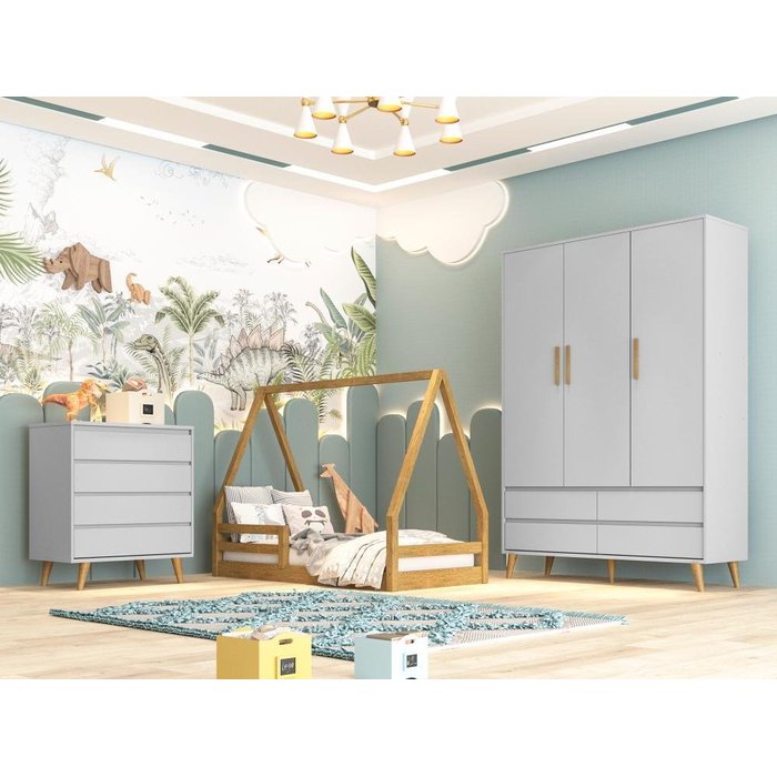 Quarto Infantil Completo Lorena Cama Casinha Montessoriano Duda Guarda Roupa 3 Portas Cômoda Cinza
