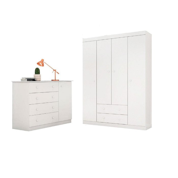 ROUPEIRO + CÔMODA ELISA – PHOENIX BABY Leve já para casa esse jogo de quarto completo!! O Roupeiro Elisa possui 02 gavetas com amplo espaço interno e 04 portas. Já a Cômoda Elisa possui 4 gavetas e 1 porta, produtos produzidos com madeira MDF. Adquira já o seu!! Dimensões do Roupeiro: (Altura x Largura x Profundidade): 200 x 146 x 47 cm. Características do Roupeiro: Material da Estrutura: MDF. Volumes: 03. Peso: 86,45 kg. Dimensões da Cômoda: (Altura x Largura x Profundidade): 91 x 105 x 48 cm. Características da Cômoda : Material da Estrutura: MDF. Volumes: 01. Peso: 37,3kg. Montagem: - Manual de Montagem: Sim. O produto pode estar sendo montado pelo comprador ou por um montador profissional. Observações Importantes: - As imagens ambientadas são meramente ilustrativas e podem apresentar itens que não compõe o produto. - Limpar com flanela limpa e seca. Não molhar o móvel e não expor em lugar úmido ou próximo de fontes de calor, não usar produtos abrasivos. - Objetos decorativos que aparecem na foto não acompanham o produto. - As cores do produto podem variar de acordo com o monitor, a iluminação do ambiente ou sua percepção visual. - Os móveis são entregues desmontados e com manual de montagem. - Montagem, desmontagens, e instalações deve ser contratado um montador profissional pelo cliente. - Confira as dimensões antes da compra, e certifique-se de que o produto passará por elevadores, portas e corredores, já que nossa expedição não inclui a subida de lances de escada ou o lançamento de produtos. - Produto para uso residencial em ambiente interno, não devendo ficar exposto diretamente ao sol, calor e umidades excessivas.