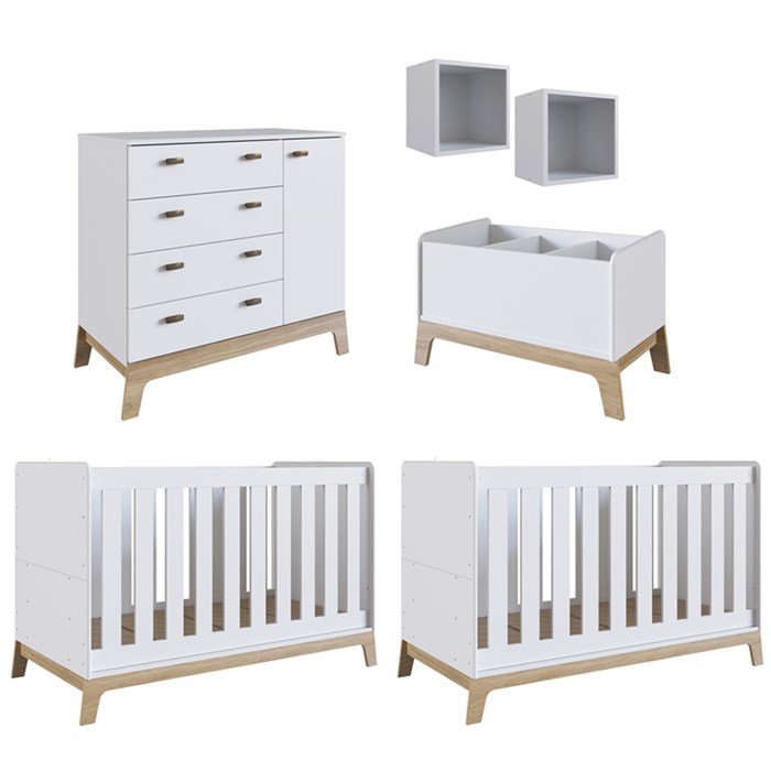 Quarto Infantil Para Gêmeos com Berços 3 em 1 + Cômoda 04 Gavetas e 01 Porta + Caixa de Brinquedos com divisórias + Nichos de Parede - Linha Favo de Mel. Estrutura em MDP de 15mm, com acabamento em pintura BP (Fosco). Porta com dobradiças metálicas e prateleira interna, gavetas com corrediças metálicas, puxadores modernos e requintados, os Berços transformam-se em mini cama, facilitando e tornando prático para a mamãe e o papai no decorrer dos meses, suporte do estrado em madeira e os lastros do estrado são em MDF, possui três opções para regulagem de altura do colchão (colchão não incluso), as grades são fixas e de talas largas em MDF proporcionando maior segurança e tranquilidade aos pais, e são indicados para colchão medindo 130x60 cm, conta com suporte para mosquiteiro. A Caixa para Brinquedos e os nichos de parede irão garantir a organização e decoração do ambiente. Mais produtos da Linha Favo de Mel, você encontra em nosso site, podendo fazer a composição completa para o quartinho do bebê. Estes móveis chegarão em sua casa separados em 07 volumes.
